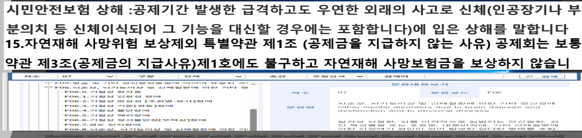 보험사 홈페이지 참조,구비서류안내,장해확인서류,후유장해진단서 사고(질병)발생일로부터 180일 경과 후 청구※2.보험대상자(피보험자)에게 보험기간중 다음 각 목의 사유가 발생하였을 경우(최초사유 발생에 한하여1회한):캐어프리보험금 지급:가."중대한 질병 및 수술 보장개시일" 이후에 중대한질병 으로 진단확정되거나"중대한 수술"을 받았을 경우 나.보장개시일 이후에 "중대한 화상 및 부식"으로진단 확정 되었을 경우※1.보험금지급설명서 2.청구사유별 세부내용 3.보험금청구 영수증→특별약관별 비교하기※별표1.보험금 지급기준표 주계약 보험약관(케어프리보험금+사망보험금)별표1.보험금 지급기준표 비교하기 보험약관 특약별 보장대상이 되는 질병 입원비,진단비,수술확인서,장해분류표,재해분류표 등진단서(질병코드,진단명,처방전)통계청고시(통계분류포털 보건분류 한국표준질병 사인분류 내용더보기(해설서)하단배너 참조)→특약관련 보험금지급설명서가 없습니다. →금감원에4번째(6년째)(특약누락건 수술확인서,후유장해진단서(사고 질병 등)민원신청→1.보험금지급설명서2.청구사유별 세부내용 3보험금청구 영수증(현금) 민원 추가 예정.※특정질병수술보장→암수술자금,4대중증질환(특정뇌질환,특정심질환,특정간,췌장질환,특정폐질환)→진단서등에 용도:보험사 제출용으로 표시되어있습니다.→진단서 와 통계분류포털,보험약관(금감원 뷰어화면 표준약관 상해 약관참조)※암간호특약 [별표1] 보험금지급기준표[별표2] 보험금 지급시의 적용이율[별표3]장해분류표-주계약 [별표3] 과 동일[별표4]재해분류표 주계약 별표7과 동일 [별표5]  대상이 되는 악성신생물 분류표 [기타피부암 및 감상생암 제외] 11.분류번호 C69-C72 눈,뇌 및 충추신경계통의 기타부위의 악성신생물시민 안전보험약관 상해:공제기간 발생한 급격하고도 우연한 외래의 사고로 신체(의수,의족,의안,의치 등 신체보조장구는 제외하나,인공장기나 부분의치 등 신체에 이식되어 그 기능 을 대신할 경우에는 포함합니다)에 입은 상해를 말합니다.자연재난,자연재해[일사병,열사병]T67.0,[처체온증]T68.0 장해분류표(상해 또는 질병)-⑮자연재해 사망위험 보상제외 특별약관 제1조 (공제금을 지급하지 않는 사유)공제회는  보통약관 제3조 (공제금의 지급사유) 제1호에도 불구하고 자연재해 사망보험금을 보상하지 않습니다.제2조(준용규정) 이 특별약관에 정하지 않은 사항은 보통약관에 따릅니다. 1.재난 가.자연재난 나.사회재난  재난안전보험시행규칙 제5조(재난상황의 보고 등)→119(구급일지 재난문서)→