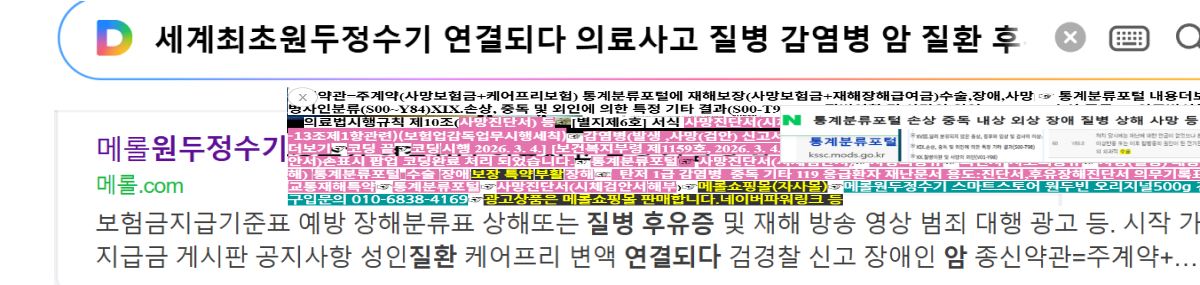 뉴스TV 사망시(의료사고)신고시 출동하지 않는 경찰은?근거자료→통신사 발신전화요청 보험 약출처(무)플러스UP변액연금 제3관 보험금등의 지급(회사의 주된 의무)교통재해특약(장해분류표,재해분류표)공지사항,광고게시판 광고 예정 아래 납입면 약관 참조 등.3.수사기간의조사경찰서방문시 구입서류 준비는?신분증,구급증명원(구급활동일지) 장애가 없슴으로 CHECK 재난번호UZ4181187 (보장대상이 되는 재해→보험약관 통계분류포털에서 IDH 검색진단서(71.9(암코드) C코드입니다. (M994.5/3)?M800~M858)신생물형대분류? 몇급감염병 입니까? (의무기록지에서 의약품처방전 확인M코드에 관련된 치료를 했는지 확인하기)→감염병 및 예방에관한 법률에서 1급감염병,2급감염병,3급감염병을(질병관리청,보건복지부) 관리가 필요하여 질병관리청장이 보건복지부장관과 협의하여 지정하는 감염병을 포함한다 "바이러스 뇌출혈,내상,외상,손상,중독,장애,사망,재해"등 코드가 너무많이 검색인 되고있습니다, 내상하고 외상만 검색해서 표시해도 외인사코드가 나옵니다.출력해서 경찰서 사망진단서,후유장해진단서,제출시 첨부해야 합니까?의사가 신고 하게되어 있습니다. 검색→"질병이환의 외인의사망→사망진단서에 외인사사망 표시하지 않습니다.통계분류포털에서 "수술"검색 수술코드가 있습니다.사망의원인(수술의사의 주요소견,해부학적인 의사의 소견) "외인사 표시를 병사(자연사)로 잘못기재함"진단서 등 허위작성 보험약관(통계분류포털에서 보장대상이되는 재해 찾기입니다) →""재해 장애" (진단서IDH표시됨 C71.9)악성신생물(자연재난,사회재난)→시민안전보험약관 확인? 의무기록지(수술확인서,후유장해진단서,사망진단서(수술확인서 표시없음)등,네이버파워링크,전화번호 광고,영상광고 등6838-4169