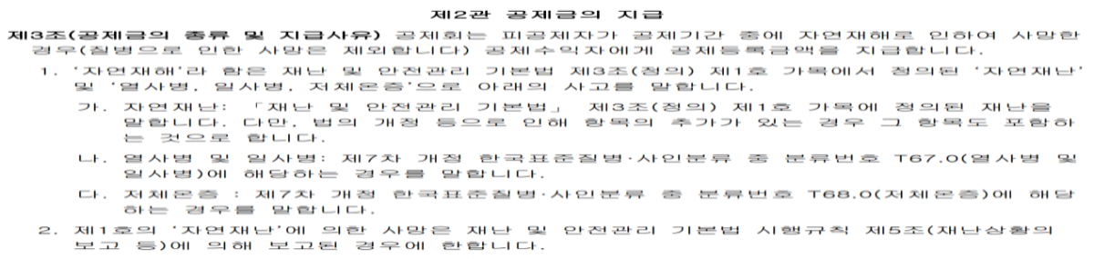 통계청고시(통계분류포털 보건분류 한국표준질병 사인분류 내용더보기(해설서)하단배너 참조)→특약관련 보험금지급설명서가 없습니다. →금감원에4번째(6년째)(특약누락건 수술확인서,후유장해진단서(사고 질병 등)민원신청→1.보험금지급설명서2.청구사유별 세부내용 3보험금청구 영수증(현금) 민원 추가 예정.※특정질병수술보장→암수술자금,4대중증질환(특정뇌질환,특정심질환,특정간,췌장질환,특정폐질환)→진단서등에 용도:보험사 제출용으로 표시되어있습니다.→진단서 와 통계분류포털,보험약관(금감원 뷰어화면 표준약관 상해 약관참조)※암간호특약 [별표1] 보험금지급기준표[별표2] 보험금 지급시의 적용이율[별표3]장해분류표-주계약 [별표3] 과 동일[별표4]재해분류표 주계약 별표7과 동일 [별표5] 대상이 되는 악성신생물 분류표 [기타피부암 및 감상생암 제외] 11.분류번호 C69-C72 눈,뇌 및 충추신경계통의 기타부위의 악성신생물※시민 안전보험약관 상해:공제기간 발생한 급격하고도 우연한 외래의 사고로 신체(의수,의족,의안,의치 등 신체보조장구는 제외하나,인공장기나 부분의치 등 신체에 이식되어 그 기능 을 대신할 경우에는 포함합니다)에 입은 상해를 말합니다.자연재난,자연재해[일사병,열사병]T67.0,[처체온증]T68.0 장해분류표(상해 또는 질병)-⑮자연재해 사망위험 보상제외 특별약관 제1조 (공제금을 지급하지 않는 사유)공제회는 보통약관 제3조 (공제금의 지급사유) 제1호에도 불구하고 자연재해 사망보험금을 보상하지 않습니다.제2조(준용규정) 이 특별약관에 정하지 않은 사항은 보통약관에 따릅니다. 1.재난 가.자연재난 나.사회재난 |