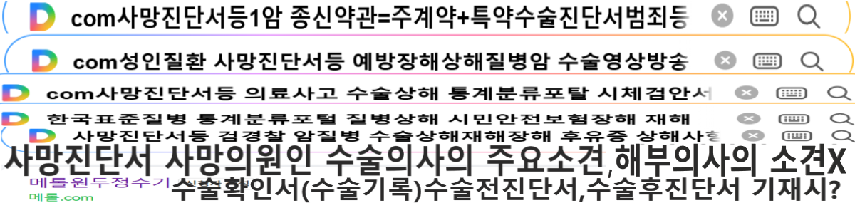 뉴스TV 사망시(의료사고)신고시 출동하지 않는 경찰은?근거자료→통신사 발신전화요청 보험 약출처(무)플러스UP변액연금 제3관 보험금등의 지급(회사의 주된 의무)교통재해특약(장해분류표,재해분류표)공지사항,광고게시판 광고 예정 아래 납입면제 약관 참조 등.3.수사기간의조사경찰서방문시 구입서류 준비는?신분증,구급증명원(구급활동일지) 장애가 없슴으로 CHECK 재난번호UZ4181187 (보장대상이 되는 재해→보험약관 통계분류포털에서 IDH 검색진단서(71.9(암코드) C코드입니다. (M994.5/3)?M800~M858)신생물형대분류? 몇급감염병 입니까? (의무기록지에서 의약품처방전 확인M코드에 관련된 치료를 했는지 확인하기)→감염병 및 예방에관한 법률에서 1급감염병,2급감염병,3급감염병을(질병관리청,보건복지부) 관리가 필요하여 질병관리청장이 보건복지부장관과 협의하여 지정하는 감염병을 포함한다 "바이러스 뇌출혈,내상,외상,손상,중독,장애,사망,재해"등 코드가 너무많이 검색인 되고있습니다, 내상하고 외상만 검색해서 표시해도 외인사코드가 나옵니다.출력해서 경찰서 사망진단서,후유장해진단서,제출시 첨부해야 합니까?의사가 신고 하게되어 있습니다. 검색→"질병이환의 외인의사망→사망진단서에 외인사사망 표시하지 않습니다.통계분류포털에서 "수술"검색 수술코드가 있습니다.사망의원인(수술의사의 주요소견,해부학적인 의사의 소견) "외인사 표시를 병사(자연사)로 잘못기재함"진단서 등 허위작성 보험약관(통계분류포털에서 보장대상이되는 재해 찾기입니다) →""재해 장애" (진단서IDH표시됨 C71.9)악성신생물(자연재난,사회재난)→시민안전보험약관 확인? 의무기록지(수술확인서,후유장해진단서,사망진단서(수술확인서 표시없음)등,네이버파워링크,전화번호 광고,영상광고 등6838-4169