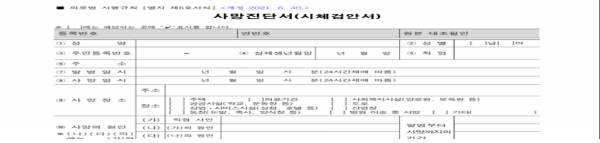 의료법 시행규칙(별지)제6호서식 <개정 2021. 6.30> 사망진단서(시체검안서)보험약관 주계약1.보험금지급기준표 특약중 재해보장 별표1 보험금지급기준표 주계약과 비교확인 등 사망진단서(시체검안서)심장정지 진단서가 없습니다.병원등 문의  응급의료에 관한 법률 시행규칙 ( 약칭: 응급의료법 시행규칙 ) [시행 2025. 3. 11.][보건복지부령 제1096호, 2025. 3. 11., 타법개정]>보험약관 기타재해 119 은급환자 이송서류(구급증명서),병원(산소호흡기 진료비세부내역서)->보험사 서류제출 예정