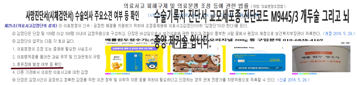 뉴스TV 사망시(의료사고)신고시 출동하지 않는 경찰은?근거자료→통신사 발신전화요청 보험 약출처(무)플러스UP변액연금 제3관 보험금등의 지급(회사의 주된 의무)교통재해특약(장해분류표,재해분류표)공지사항,광고게시판 광고 예정 아래 납입면 약관 참조 등.3.수사기간의조사경찰서방문시 구입서류 준비는?신분증,구급증명원(구급활동일지) 장애가 없슴으로 CHECK 재난번호UZ4181187 (보장대상이 되는 재해→보험약관 통계분류포털에서 IDH 검색진단서(71.9(암코드) C코드입니다. (M994.5/3)?M800~M858)신생물형대분류? 몇급감염병 입니까? (의무기록지에서 의약품처방전 확인M코드에 관련된 치료를 했는지 확인하기)→감염병 및 예방에관한 법률에서 1급감염병,2급감염병,3급감염병을(질병관리청,보건복지부) 관리가 필요하여 질병관리청장이 보건복지부장관과 협의하여 지정하는 감염병을 포함한다 "바이러스 뇌출혈,내상,외상,손상,중독,장애,사망,재해"등 코드가 너무많이 검색인 되고있습니다, 내상하고 외상만 검색해서 표시해도 외인사코드가 나옵니다.출력해서 경찰서 사망진단서,후유장해진단서,제출시 첨부해야 합니까?의사가 신고 하게되어 있습니다. 검색→"질병이환의 외인의사망→사망진단서에 외인사사망 표시하지 않습니다.통계분류포털에서 "수술"검색 수술코드가 있습니다.사망의원인(수술의사의 주요소견,해부학적인 의사의 소견) "외인사 표시를 병사(자연사)로 잘못기재함"진단서 등 허위작성 보험약관(통계분류포털에서 보장대상이되는 재해 찾기입니다) →""재해 장애" (진단서IDH표시됨 C71.9)악성신생물(자연재난,사회재난)→시민안전보험약관 확인? 의무기록지(수술확인서,후유장해진단서,사망진단서(수술확인서 표시없음)등,네이버파워링크,전화번호 광고,영상광고 등6838-4169