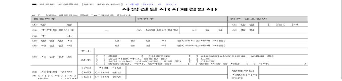 의료법 시행규칙(별지)제6호서식 <개정 2021. 6.30> 사망진단서(시체검안서)보험약관 주계약1.보험금지급기준표 특약중 재해보장 별표1 보험금지급기준표 주계약과 비교확인 등 사망진단서(시체검안서)심장정지 진단서가 없습니다.병원등 문의  응급의료에 관한 법률 시행규칙 ( 약칭: 응급의료법 시행규칙 ) [시행 2025. 3. 11.][보건복지부령 제1096호, 2025. 3. 11., 타법개정]>보험약관 기타재해 119 은급환자 이송서류(구급증명서),병원(산소호흡기 진료비세부내역서)->보험사 서류제출 예정