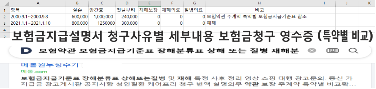 보험약관 특약별 보험금지급기준표 보장대상이 되는 질병코드(통계분류포털)장해분류표 재해분류표(실손보험특약별도80%),보험금지급설명서,청구사유별 세부내용,보험금청구 영수증 (특약별 비교)