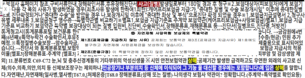 통계청고시(통계분류포털 보건분류 한국표준질병 사인분류 내용더보기(해설서)하단배너 참조)→특약관련 보험금지급설명서가 없습니다. →금감원에4번째(6년째)(특약누락건 수술확인서,후유장해진단서(사고 질병 등)민원신청→1.보험금지급설명서2.청구사유별 세부내용 3보험금청구 영수증(현금) 민원 추가 예정.※특정질병수술보장→암수술자금,4대중증질환(특정뇌질환,특정심질환,특정간,췌장질환,특정폐질환)→진단서등에 용도:보험사 제출용으로 표시되어있습니다.→진단서 와 통계분류포털,보험약관(금감원 뷰어화면 표준약관 상해 약관참조)※암간호특약 [별표1] 보험금지급기준표[별표2] 보험금 지급시의 적용이율[별표3]장해분류표-주계약 [별표3] 과 동일[별표4]재해분류표 주계약 별표7과 동일 [별표5] 대상이 되는 악성신생물 분류표 [기타피부암 및 감상생암 제외] 11.분류번호 C69-C72 눈,뇌 및 충추신경계통의 기타부위의 악성신생물※시민 안전보험약관 상해:공제기간 발생한 급격하고도 우연한 외래의 사고로 신체(의수,의족,의안,의치 등 신체보조장구는 제외하나,인공장기나 부분의치 등 신체에 이식되어 그 기능 을 대신할 경우에는 포함합니다)에 입은 상해를 말합니다.자연재난,자연재해[일사병,열사병]T67.0,[처체온증]T68.0 장해분류표(상해 또는 질병)-나의생각 보험사 약관이? 정확합니다.(주계약+특약별로 확인요등) |